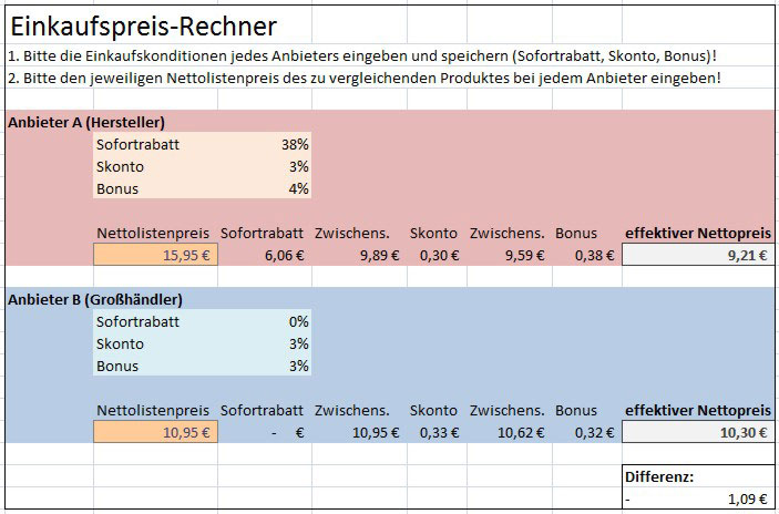 Der Hauptlieferant bietet also einen festen Einkaufsrabatt (Sofortrabatt), einen Skonto bei Lastschrifteinzug vom Konto und zusätzlich einen Bonus bei Erreichen eines bestimmten Jahresumsatzes. Der Großhändler bietet ebenfalls einen Skonto bei Lastschrift und einen Bonus am Jahresende – aber keinen Sofortrabatt. Um zu erfahren, wie sich die Unterschiede in den Konditionen beim Kauf eines bestimmten Produktes niederschlagen, müssten wir für beide Anbieter den tatsächlichen Einkaufspreis dieses Produktes berechnen: